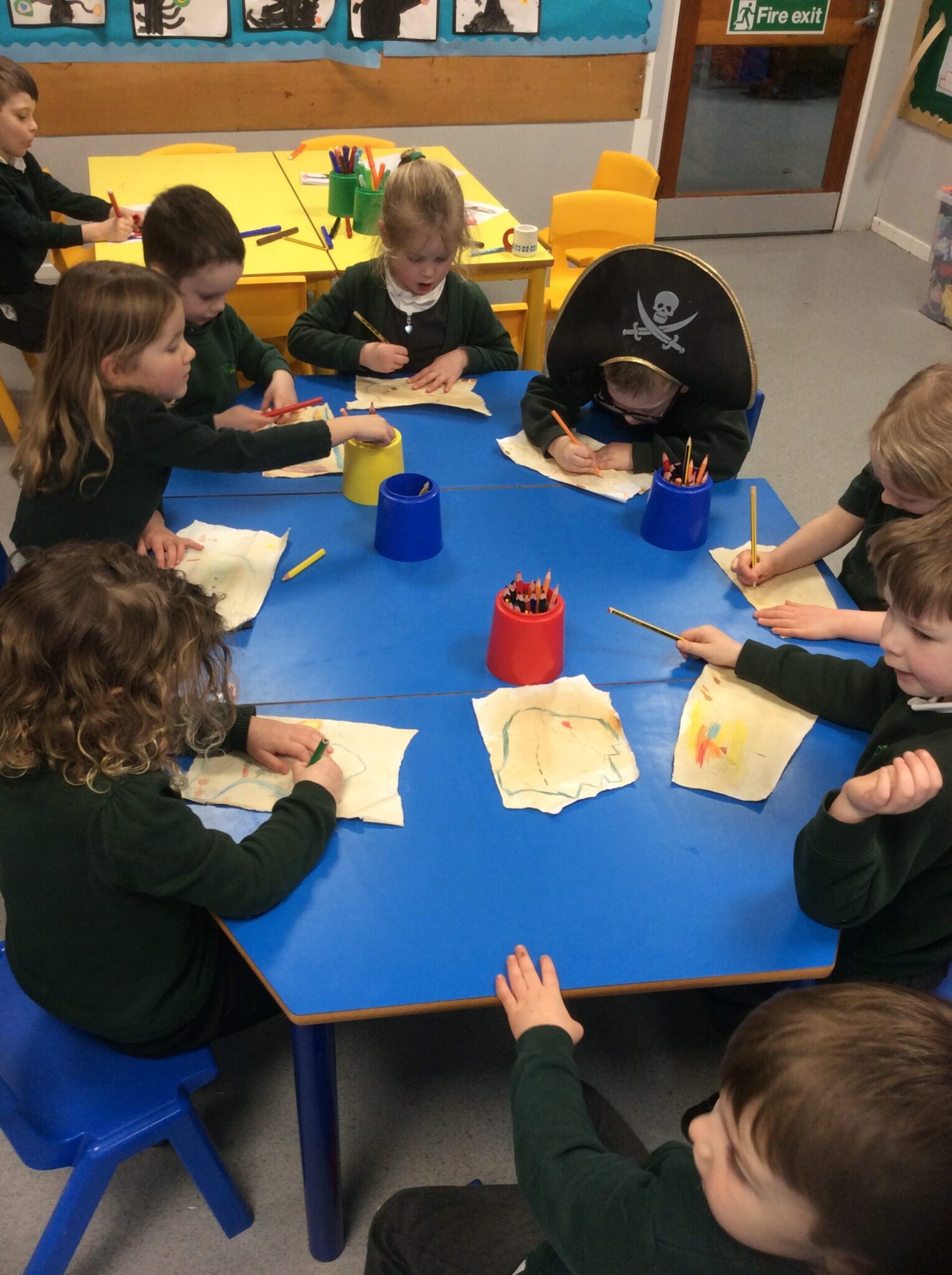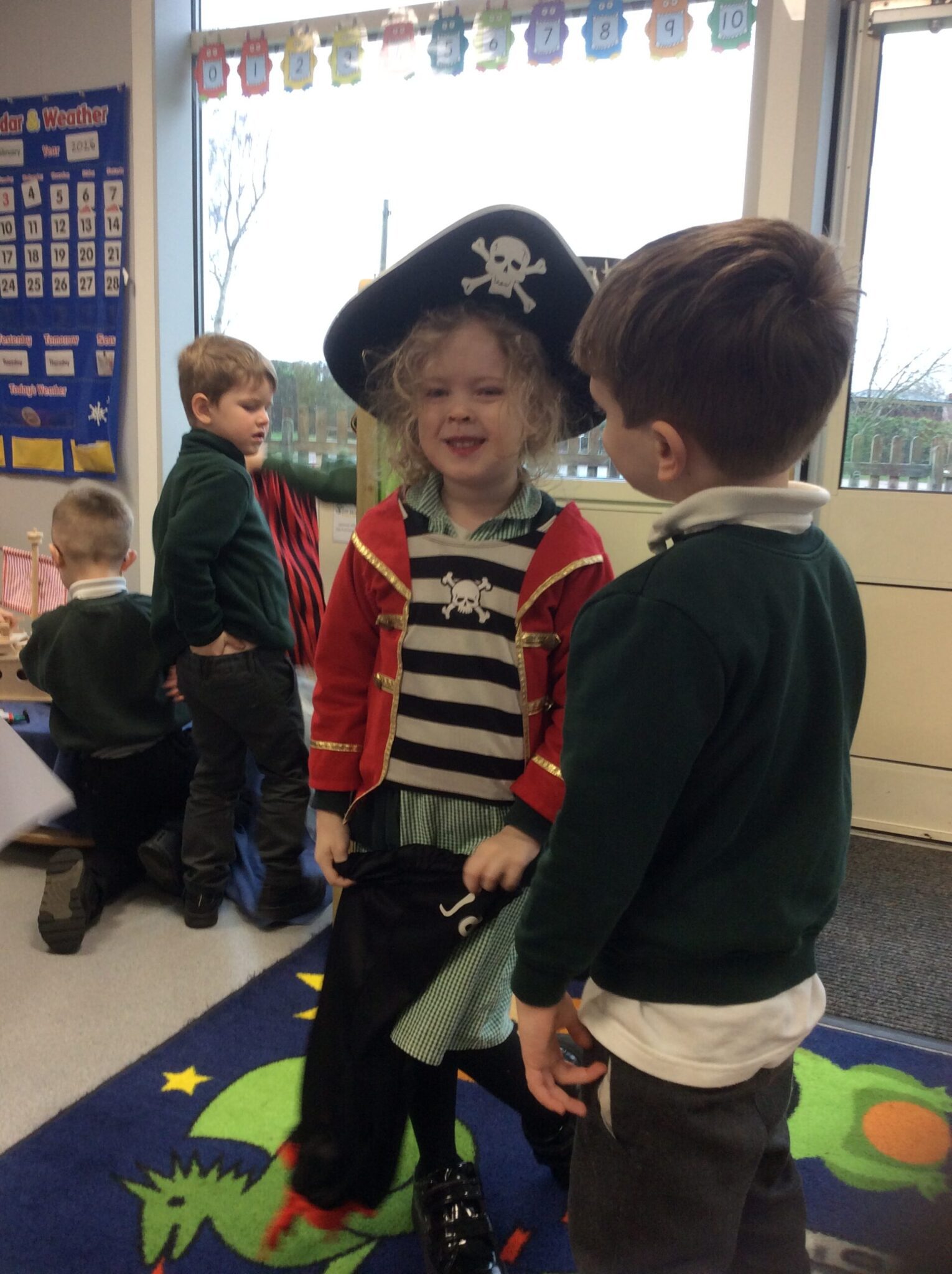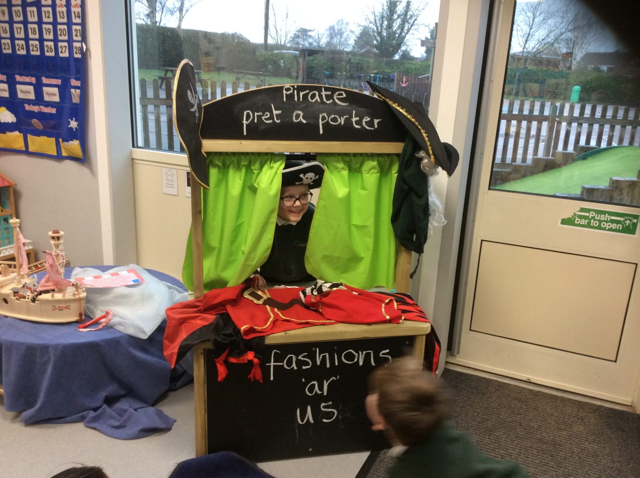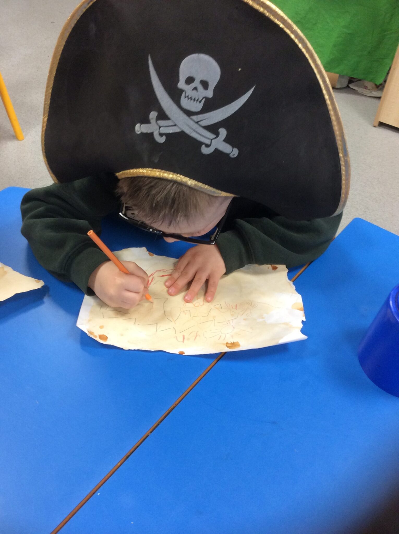 We’ve had a wonderful day inspired by the book The Pirates Next Door. We have made our own pirate hats, tea-stained treasure maps and brought our role play to life with costumes and a pirate shop. We got creative at the easel and painted our own routes around pirate island and put our phonics skills into practice when we wrote our labels for ships, hills, rivers and mountains.