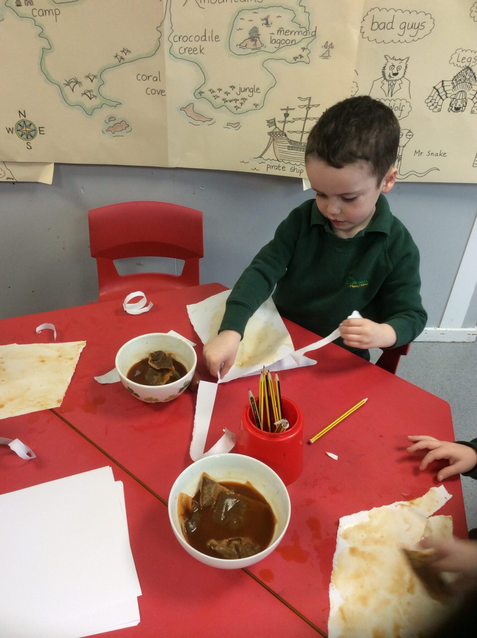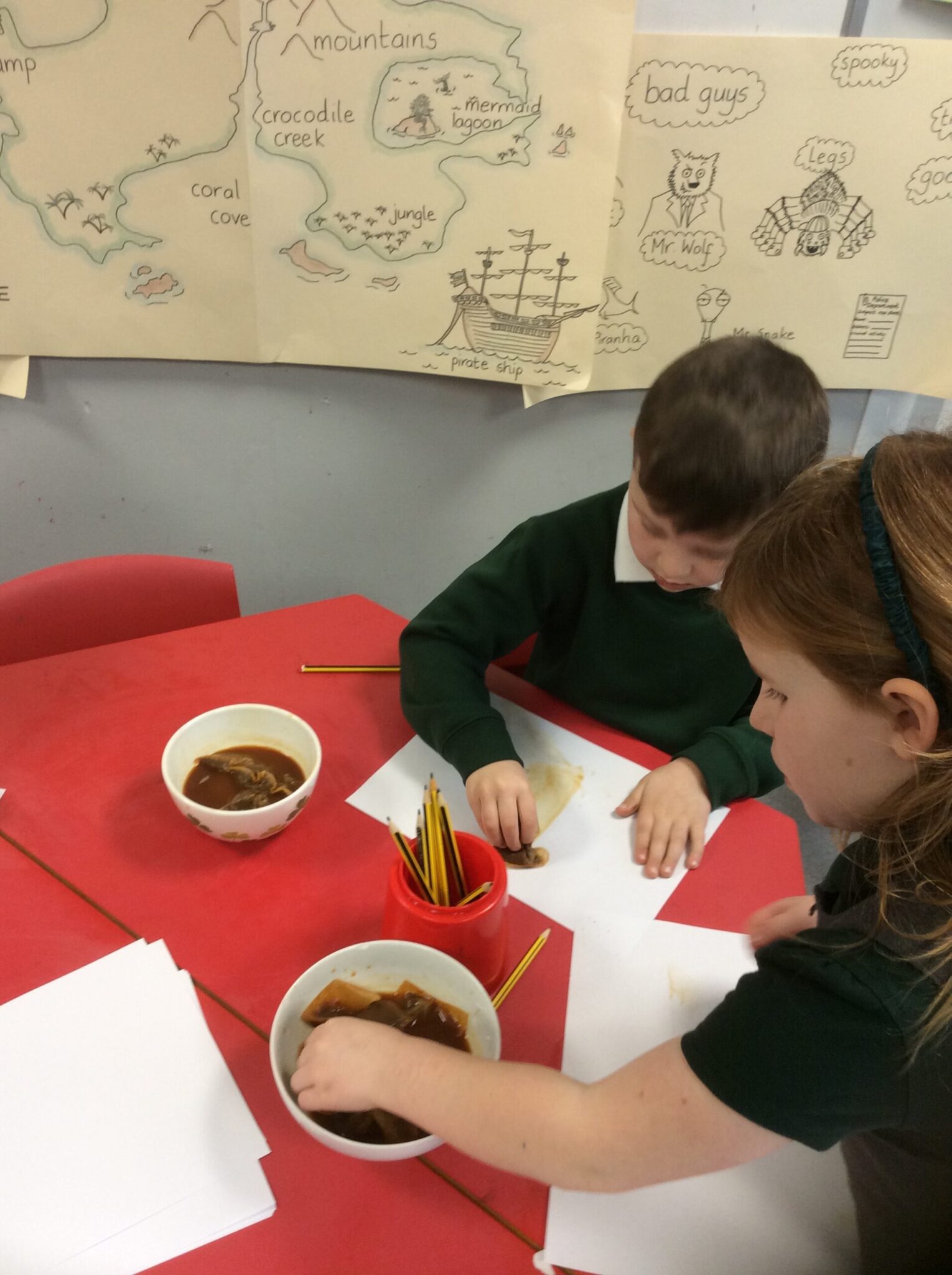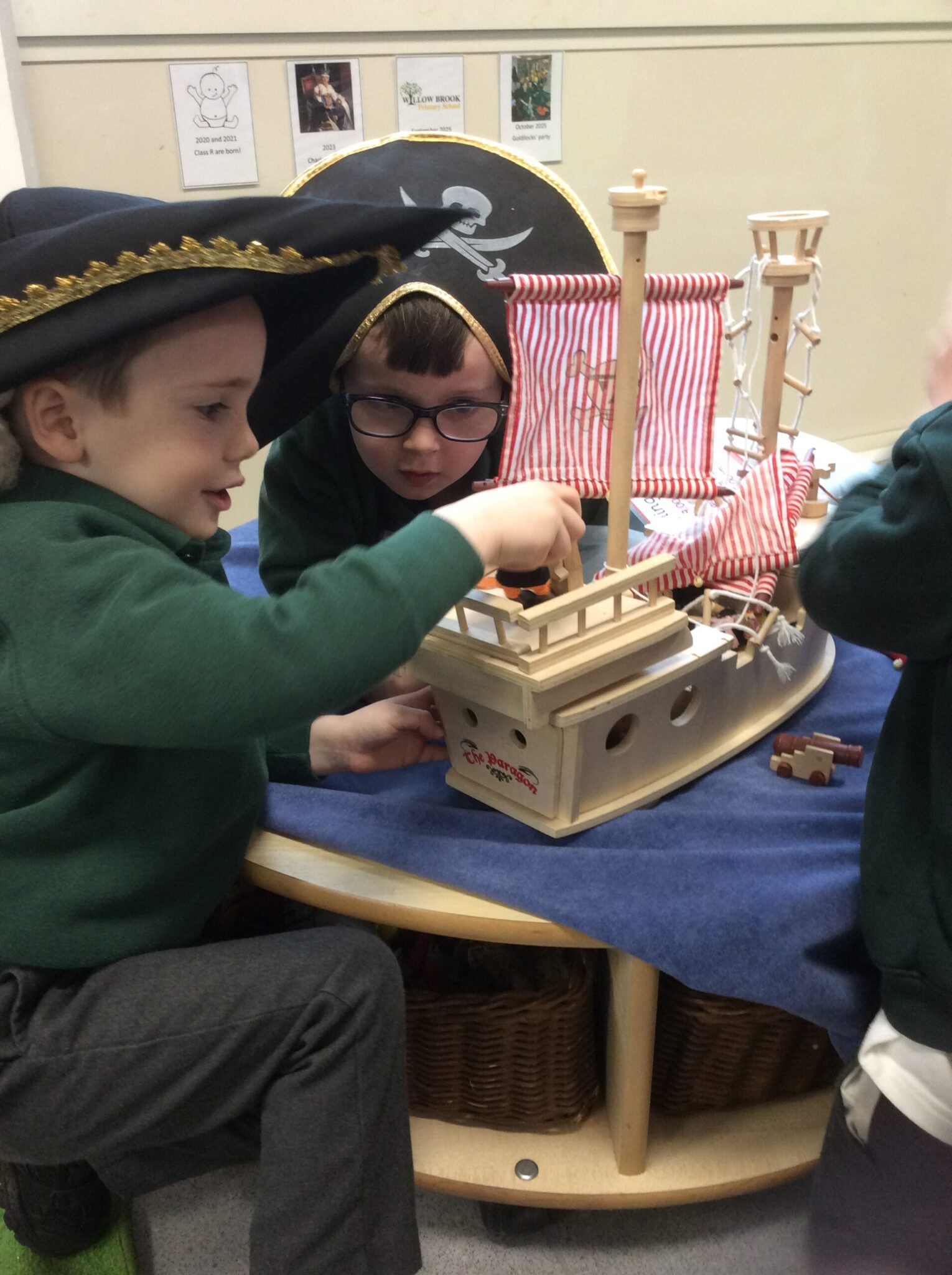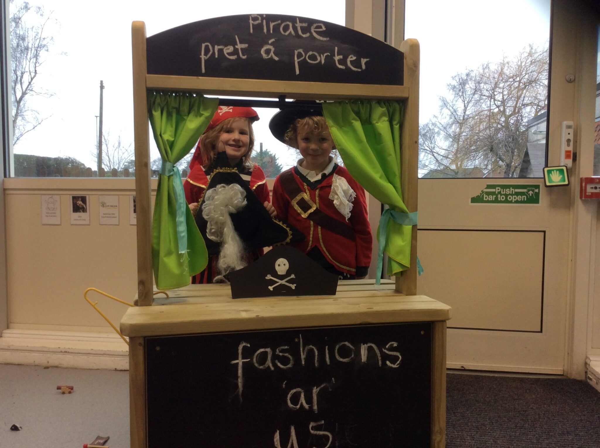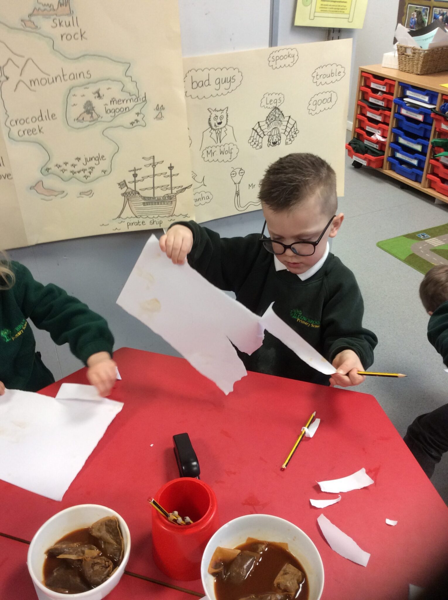 We’ve had a wonderful day inspired by the book The Pirates Next Door. We have made our own pirate hats, tea-stained treasure maps and brought our role play to life with costumes and a pirate shop. We got creative at the easel and painted our own routes around pirate island and put our phonics skills into practice when we wrote our labels for ships, hills, rivers and mountains.